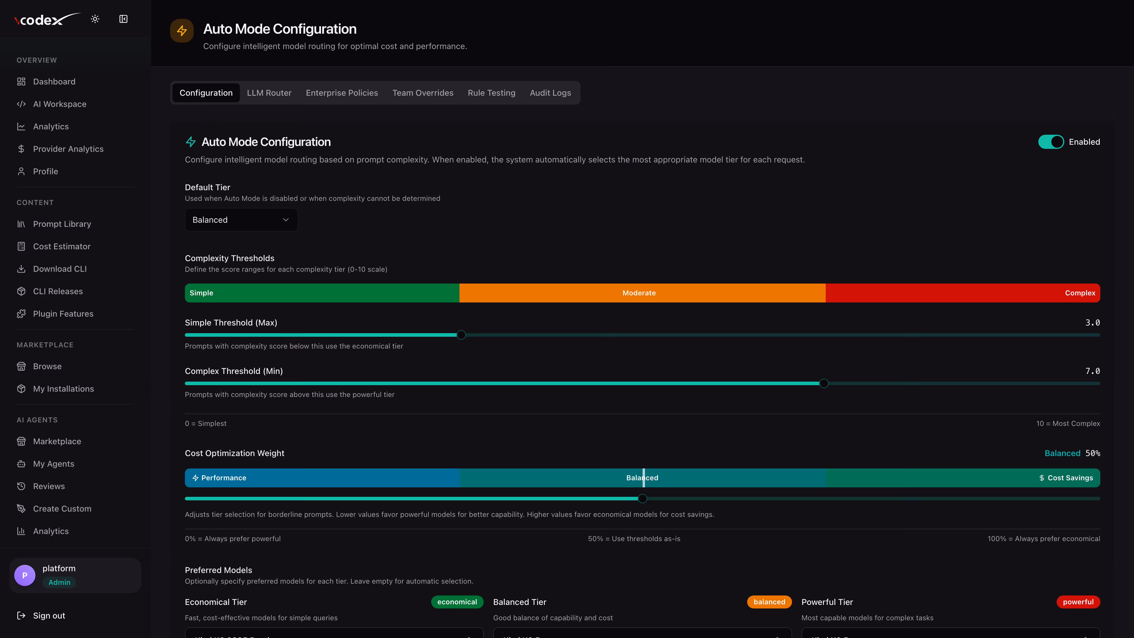 Auto-Mode Routing is vCodeX's intelligent query router. It analyzes each query's complexity and automatically routes it to the most cost-effective model tier — Economical (simple queries), Balanced (moderate), or Powerful (complex). This saves 40–60% on AI spend without any manual intervention.